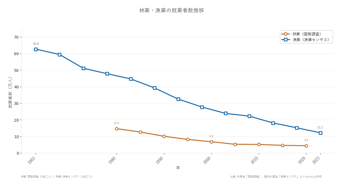 林業就業者は1980年の14.6万人から2020年に4.4万人へ70.1%減少。漁業は1963年の62.6万人から2023年に12.1万人へ80.6%減。両産業とも65歳以上が全体の4分の1を超え、担い手危機は数字が裏付けている。